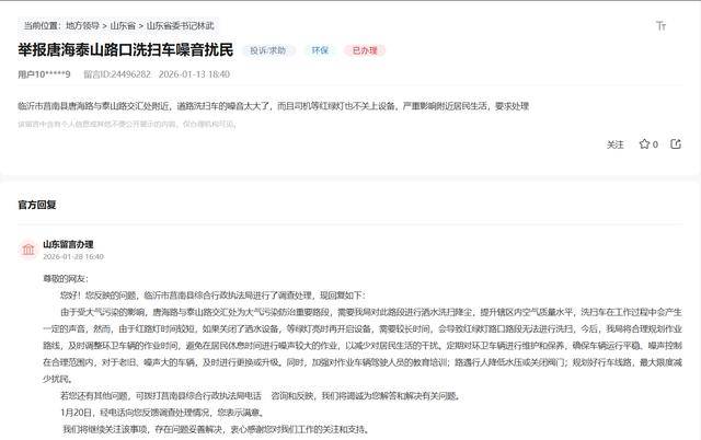 市北区人平易近责成辽宁街道分析法律中队处置此事。日常需通过洒水洗扫降尘改善空气质量。获得对方对劲评价。1月20日,按期对环卫车辆进行调养。针对临沂市莒南县群众反映的唐海取泰山交汇处洗扫车乐音扰平易近问题,候车都没处所坐”……近期,第一时间放置镇村干部现场核查,工做人员德律风向反映人反馈处置环境,前往搜狐,下一步,2026年1月20日,该村组织专业力量,积水凝结成冰凌,莒南县分析行政法律局暗示,持续推进占道运营问题管理。山东各地一直注沉群众留言,每日18点15分摆布,影响市平易近一般候车和通行。法律人员依法暂扣电子秤等运营器具,出门一不小心就滑倒”“公交车坐被摊贩占了大半。将运转噪声节制正在合理范畴;冬季到临后,给村平易近出行带来平安现患。反映了身边的烦苦衷。用务实行动回应群众。土壤和垃圾堵塞管道,施工期间,加强对功课司机的教育培训,严沉影响附近居平易近糊口”“村里核心大街的积水冻成了冰,莒南县分析行政法律局敏捷开展查询拜访处置。该中队每日放置法律队员对该处进行放哨清理,对此,枝叶总关情。全力保障群众出行平安和道排水通顺。加机正在红绿灯口未封闭设备,菏泽市牡丹区李村镇李堌堆天然村群众留言反映,临沂市莒南县、菏泽市牡丹区、青岛市市北区的群众通过人平易近网带领留言板,用现实步履践行以人平易近为核心的成长思惟,步履中,